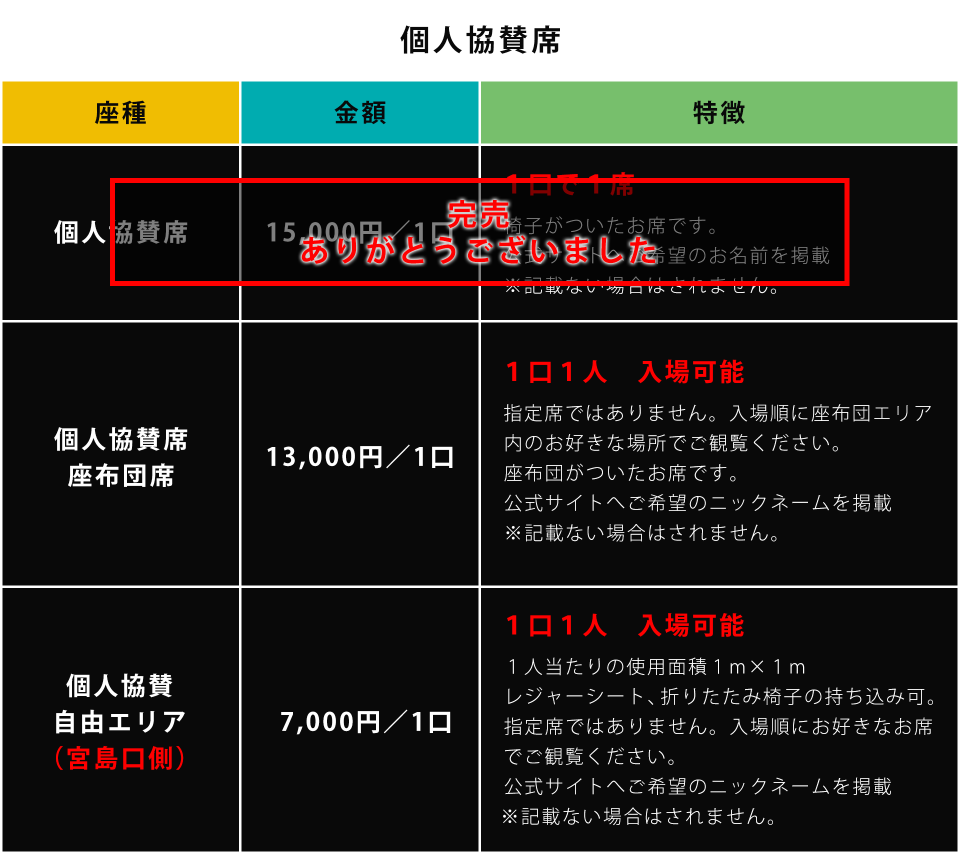 9/15 12時より 追加販売 | 個人協賛 座布団席 | 13,000円 / 1口 | 1口で1人 入場可能 |
