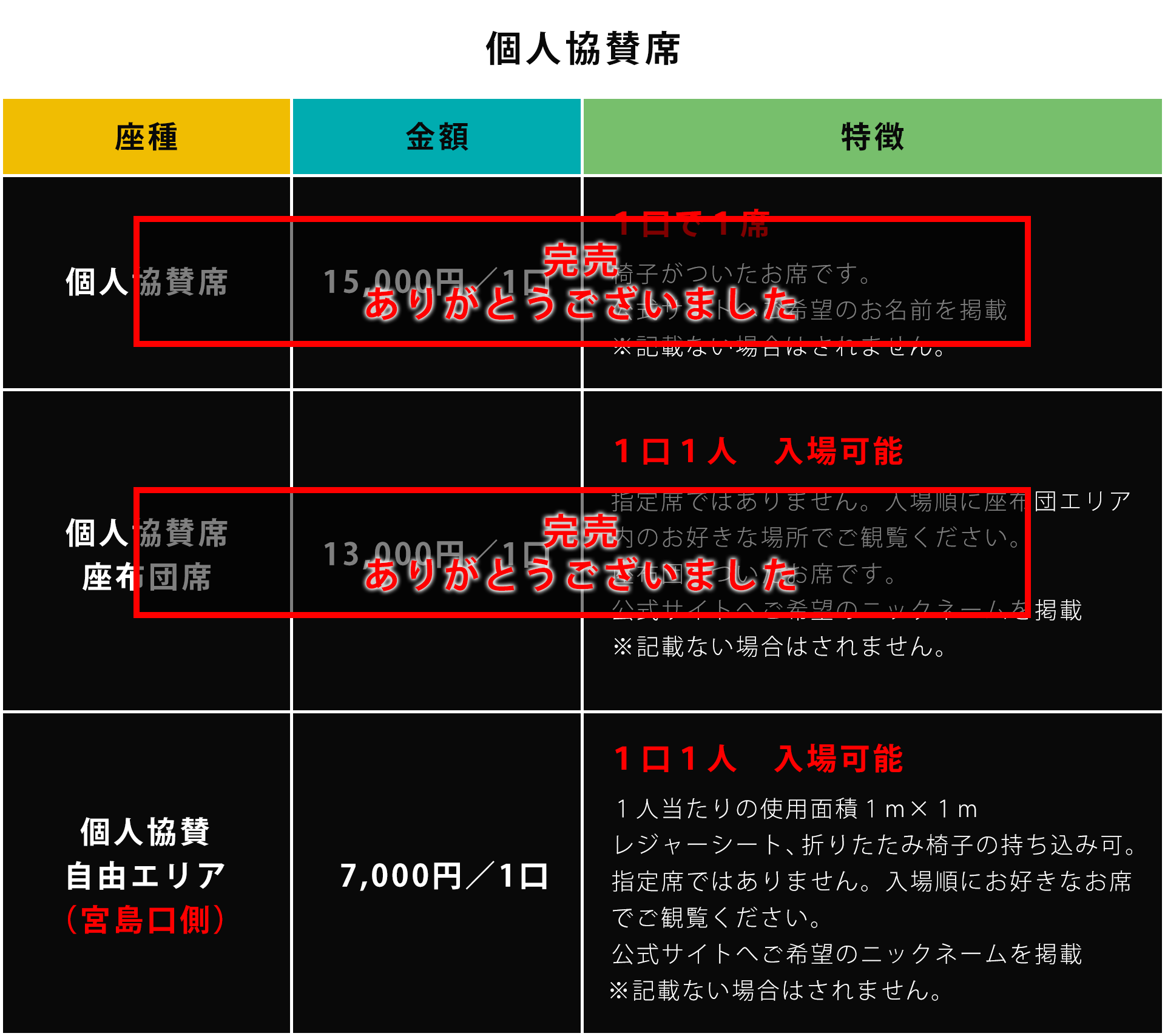 | 追加販売 | 個人協賛 自由エリア | 7,000円 / 1口 | 1口で1人 入場可能 |